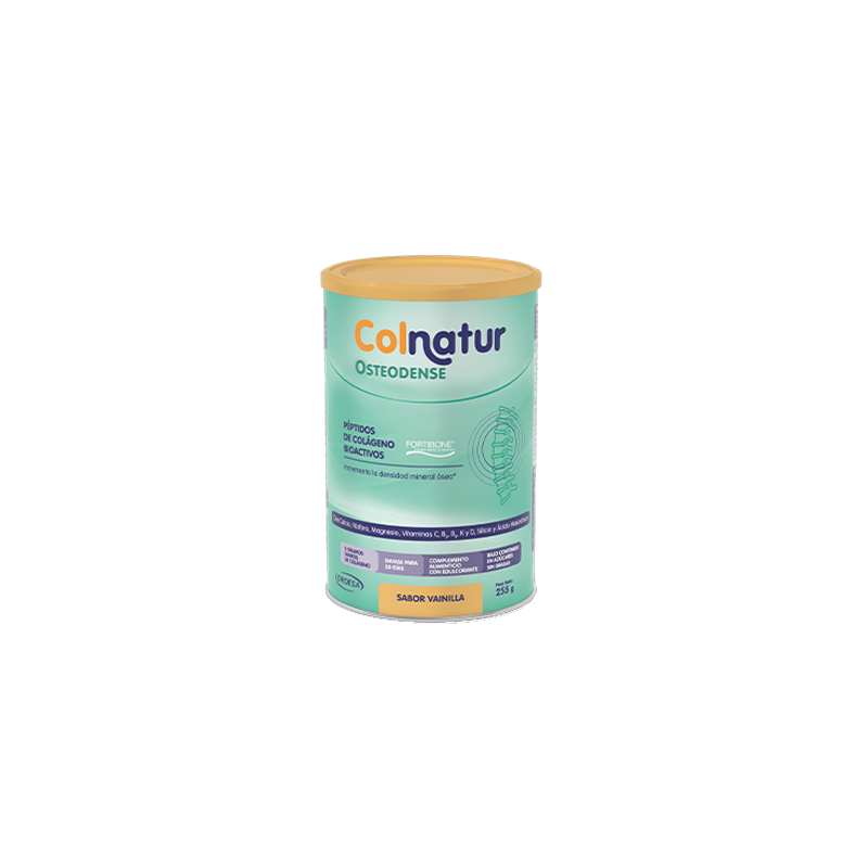 Complemento alimenticio con edulcorante a base de péptidos de colágeno bioactivos FORTIBONE® enriquecido con calcio y fósforo (procedente de la leche), magnesio, vitaminas C, B3, B2, K2, D3, silicio (extracto de bambú) y ácido hialurónico.